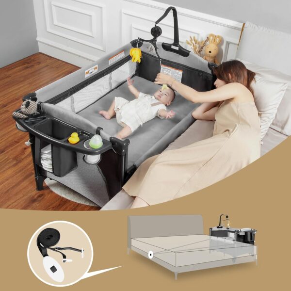 Designed for convenience, the product includes a bedside bassinet. This feature allows you to easily access your baby while feeding or changing diapers at night. The bassinet’s design ensures your baby is always close by while you enjoy the convenience of a separate sleeping space.