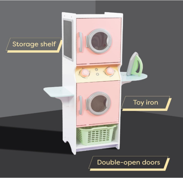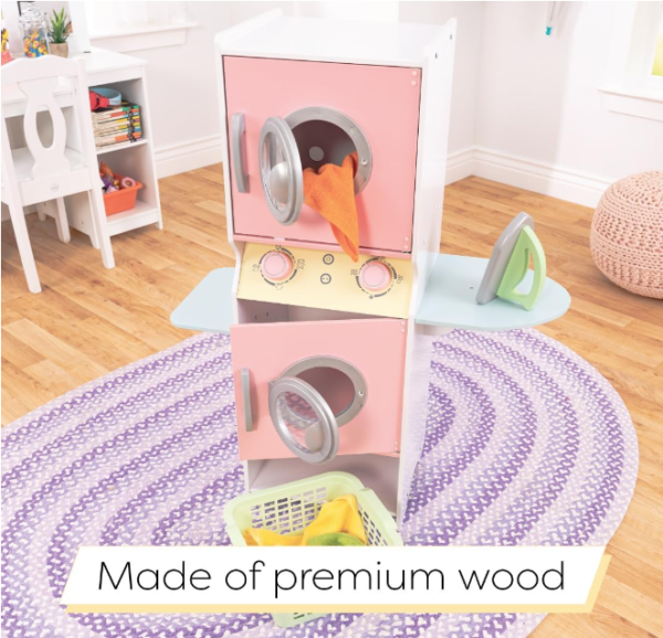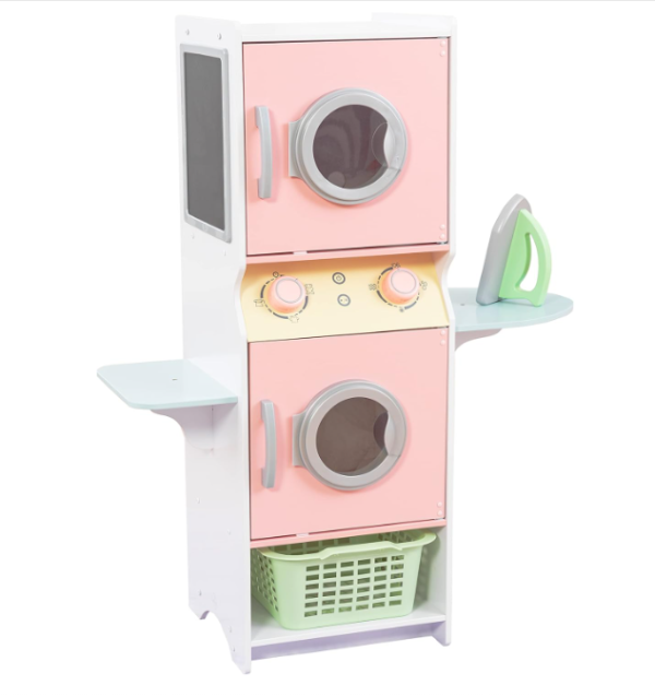 KidKraft Laundry Playset Children’s Pretend Wooden Stacking Washer and Dryer Toy with Iron and Basket, Pastel, Gift for Ages 3+