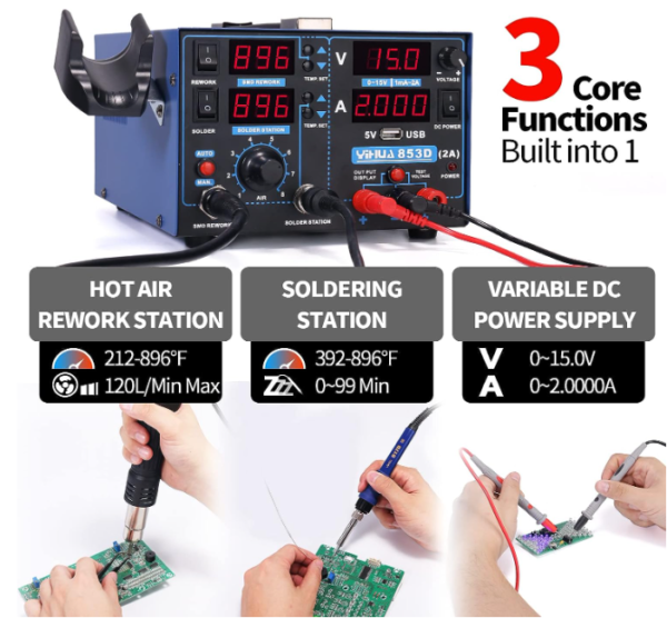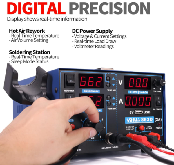 For electronics enthusiasts and professionals, a reliable soldering iron station is indispensable. The YIHUA 853D 2A USB SMD Hot Air Rework Soldering Iron Station, DC Power Supply 0-15V 0-2A with 5V USB Charging Port and 35 Volt DC Voltage Test Meter is a comprehensive tool designed to meet all your repair needs. This article explores its features, benefits, and why it should be your go-to soldering station.