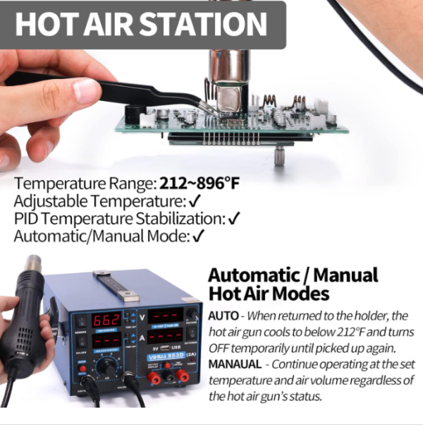 Firstly, the is celebrated for its multi-functional design. This station combines a hot air rework tool, soldering iron, DC power supply, and a USB charging port. This versatility allows you to handle a wide range of electronic repairs and projects with a single device. Consequently, it saves you space and increases efficiency in your workspace.